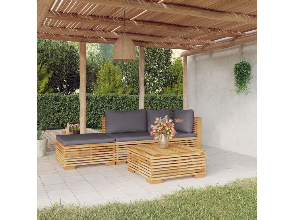 - Masívne teakové drevo: Masívne teakové drevo je krásny prírodný materiál. Bolo vyzreté, umelo vysušené a jemne obrúsené, čo mu dalo veľmi hladký vzhľad. Teakové drevo je známe svojou výnimočnou pevnosťou a odolnosťou voči poveternostným vplyvom.