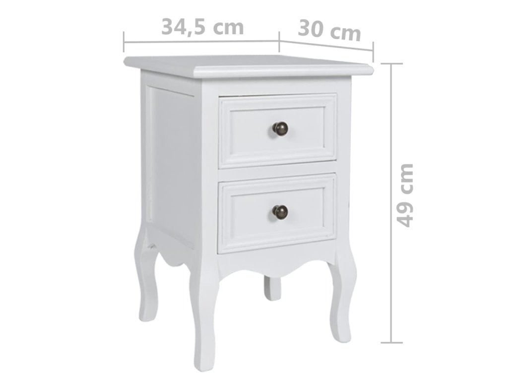 Každý kus má dve zásuvky. Bočné strany zásuviek sú vyrobené z prírodného dreva s priehľadným lakom, ktoré stolíkom ešte pridáva na elegancii. Povrch tvorí odolné biele MDF. Stolík má zaoblené nožičky a úchytky z brúseného niklu.
