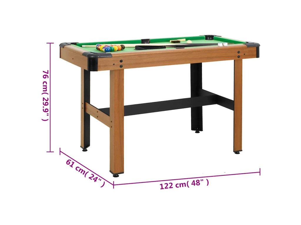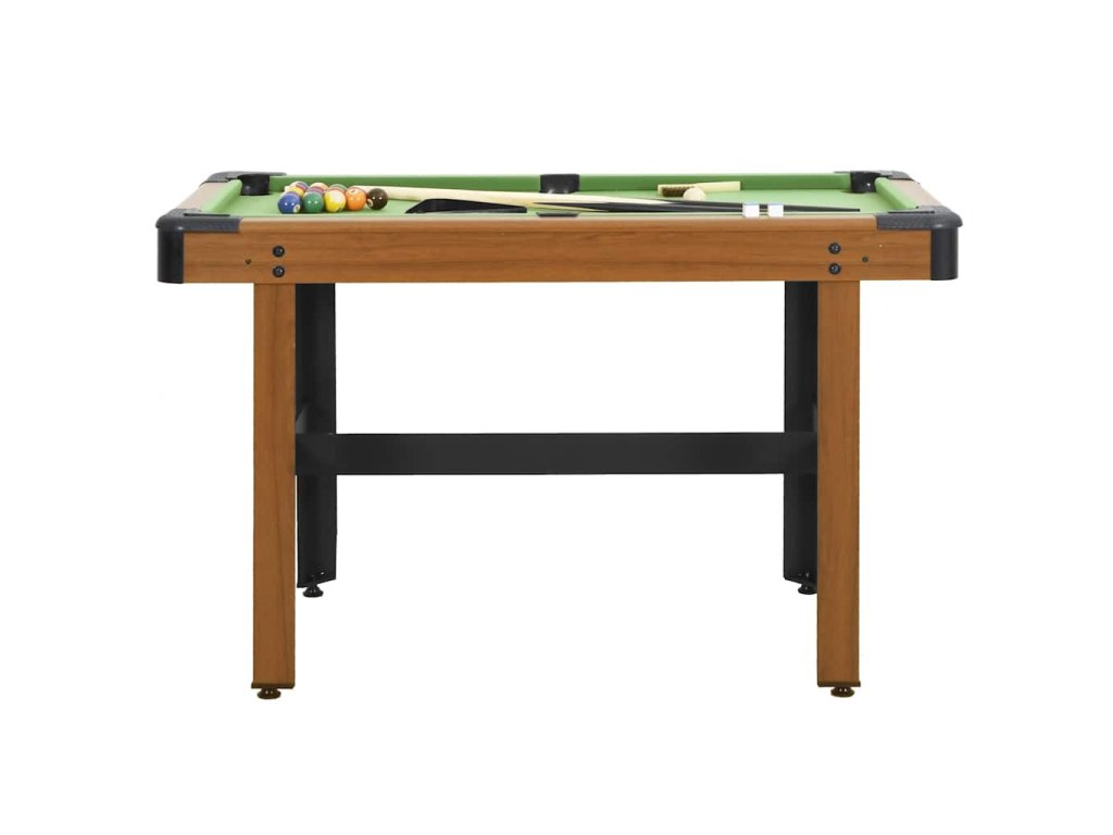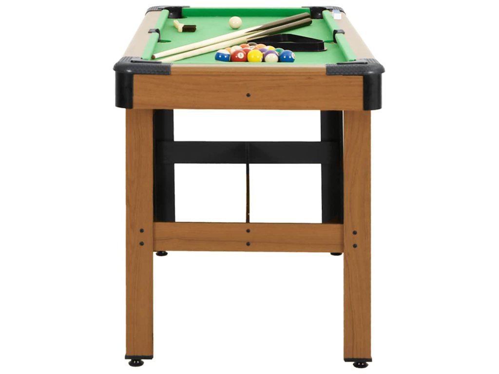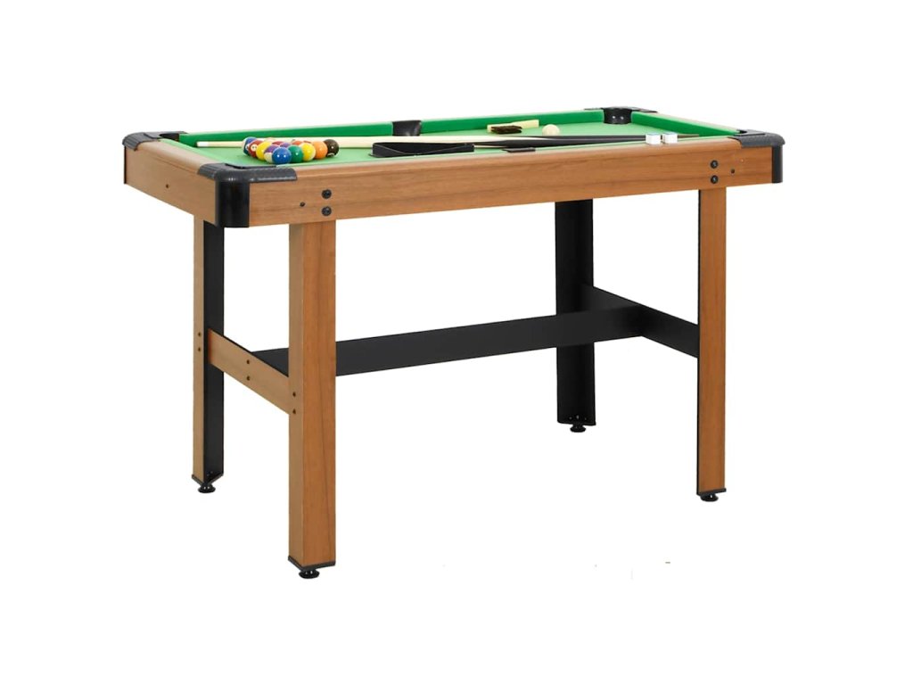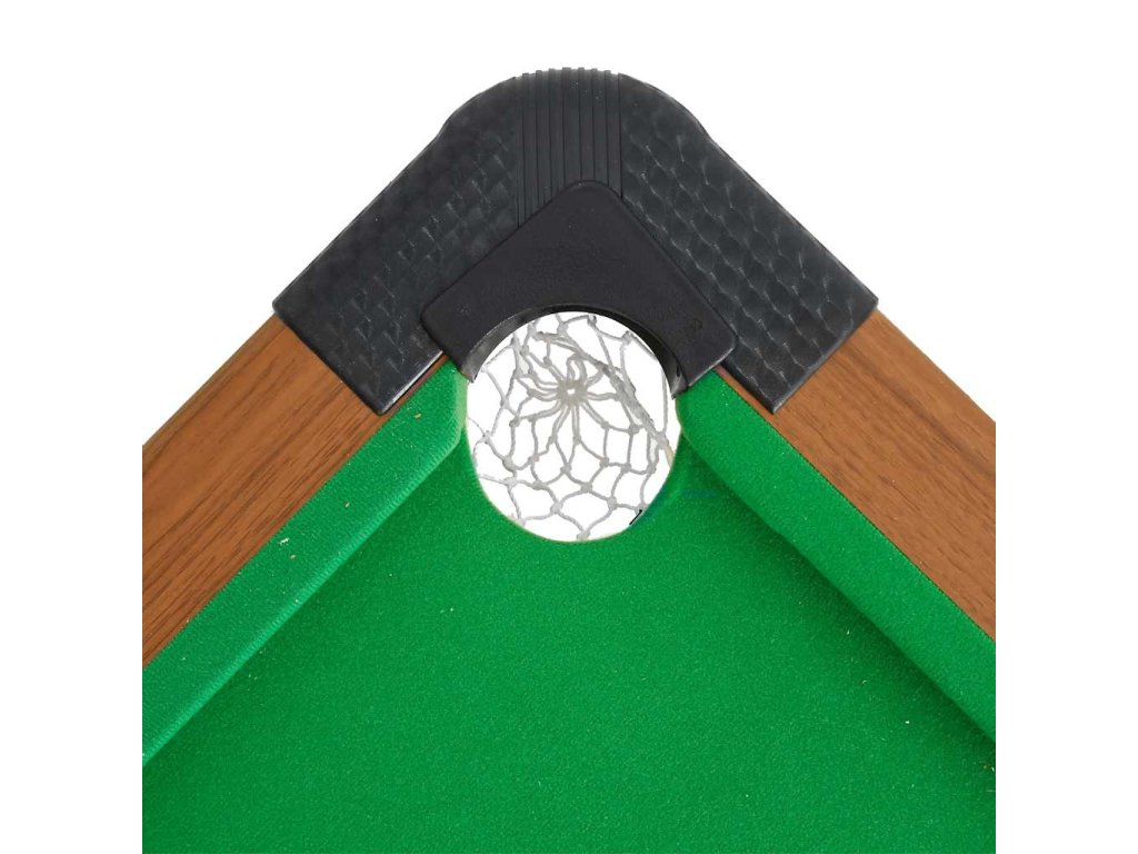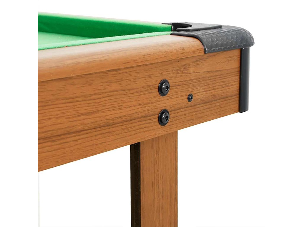 Tento biliardový stôl je vyrobený z MDF dosiek s dyhovou povrchovou úpravou z PVC, čo zaisťuje dlhoročnú životnosť. Obsahuje zabudované nastaviteľné nohy pre správne zrovnanie stola na nerovnom povrchu. Hracia plocha je pokrytá zelenou látkou odolnou voči opotrebovaniu, ktorá bola navrhnutá tak, aby v priebehu času odolávala krčeniu. Tento stôl nielenže vyzerá úžasne, ale tiež sa na ňom skvele hrá. Doprajte svojej rodine jedinečnú zábavu počas spoločných stretnutí a vytvorte si veľa nezabudnuteľných spomienok.