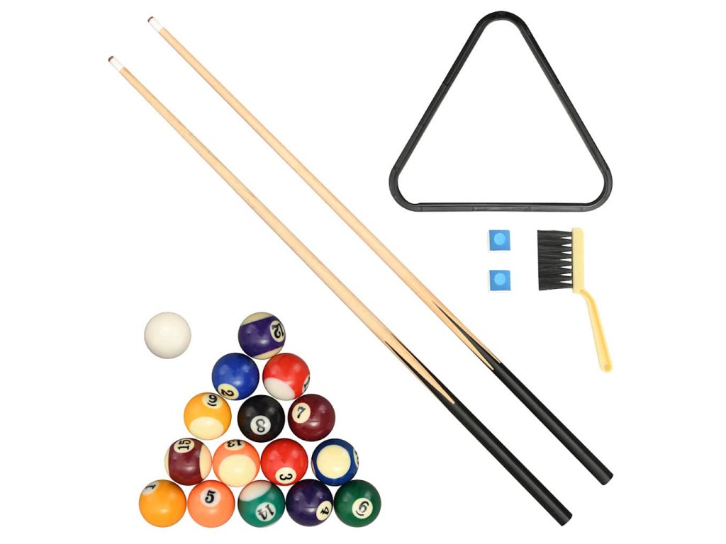 Balenie obsahuje 2 tága, 2 kriedy, 1 trojuholník, 15 očíslovaných biliardových gúľ, 1 bielu guľu a 1 kefku.