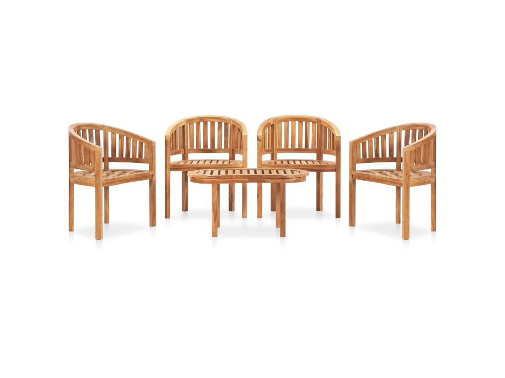 Tíkový nábytok je vyhotovený z mimoriadne trvácneho tvrdého tíkového dreva, ktoré bolo umelo vysušené v sušiarni a jeho povrch bol následne jemne obrúsený, aby získal hladký vzhľad. Tíkové drevo sa vyznačuje výnimočnou pevnosťou a odolnosťou voči poveternostným vplyvom, a tak predstavuje jeden z najvhodnejších materiálov na výrobu záhradného nábytku spomedzi všetkých ostatných druhov dreva. Ak si chcete zaobstarať záhradný nábytok, ktorý vám bude slúžiť dlhé roky, tíkové drevo je pre vás ako stvorené. Vonkajší stôl má pevnú dosku s latkovým dizajnom. Navyše dizajn stoličiek v tvare banánu dodáva tejto súprave ešte väčšiu krásu.