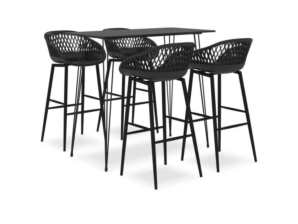 Stolová doska je vyrobená z MDF, ktorá sa ľahko čistí. Kovový rám s práškovou povrchovou úpravou zvyšuje stabilitu a pevnosť barového stola. Barové stoličky majú ergonomicky tvarované sedadlo s integrovaným nízkym operadlom v sieťovom vzhľade. Tieto barové stoličky sú vyrobené z robustného PP a podopierajú ich pevné kovové nohy s práškovou povrchovou úpravou, vďaka čomu sú odolné a trvácne.