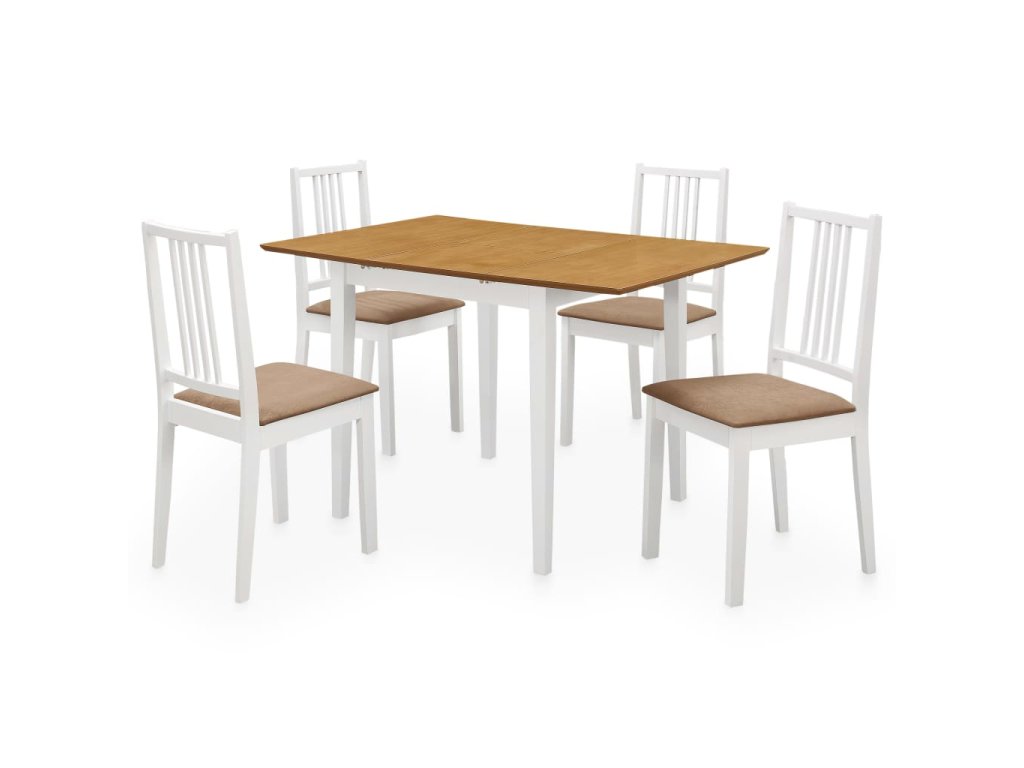 Jedálenský stôl a stoličky sú veľmi stabilné a odolné, pretože sú vyrobené z masívneho kaučkového dreva. Vďaka svojmu jedinečnému dizajnu sa sá stôl roztiahnuť, keď potrebujete viac miesta. Operadlá a vankúše stoličiek zvyšujú pohodlie počas sedenia. Táto jedálenská súprava sa ľahko čistí iba vlhkou handričkou.