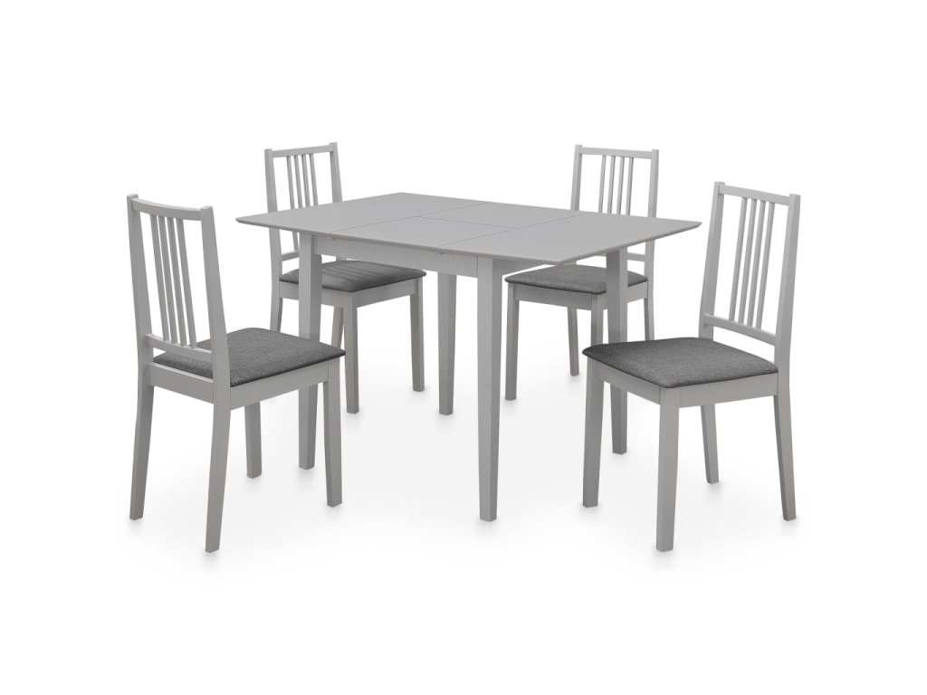 Jedálenský stôl a stoličky sú veľmi stabilné a odolné, pretože sú vyrobené z masívneho kaučkového dreva. Vďaka svojmu jedinečnému dizajnu sa sá stôl roztiahnuť, keď potrebujete viac miesta. Operadlá a vankúše stoličiek zvyšujú pohodlie počas sedenia. Táto jedálenská súprava sa ľahko čistí iba vlhkou handričkou.