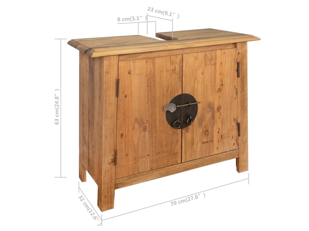 Rámy súpravy sú vyrobené z borovicového masívu, vďaka čomu sú mimoriadne robustné, stabilné a trvácne. Toaletná skrinka je navrhnutá tak, aby zakryla odpadové potrubie umývadla. Vysoká skrinka, príručná skrinka aj nástenná skrinka poskytujú množstvo priestoru na prehľadné odkladanie toaletných a kozmetických potrieb, aby ste ich mali vždy poruke. Remeselné spracovanie súprave dodáva vintage štýl. Montáž je jednoduchá. V balení sa nachádza 1 toaletná skrinka, 1 vysoká skrinka, 1 príručná skrinka, 1 nástenná skrinka a 1 zrkadlo.