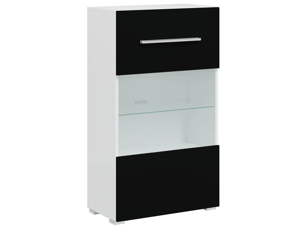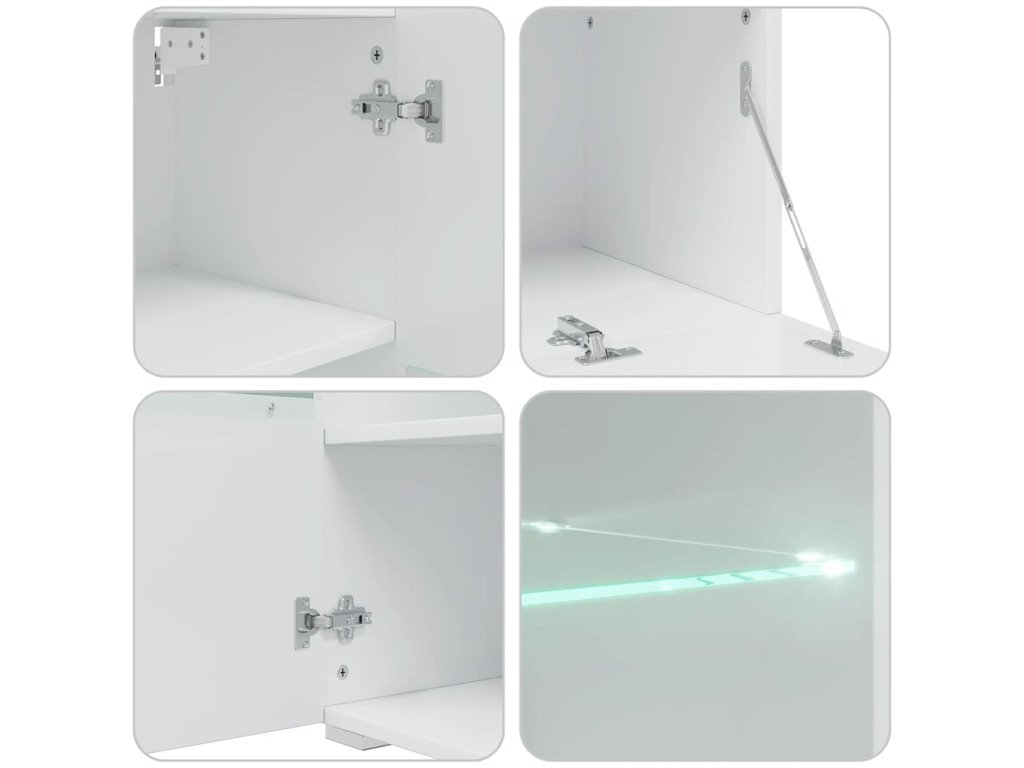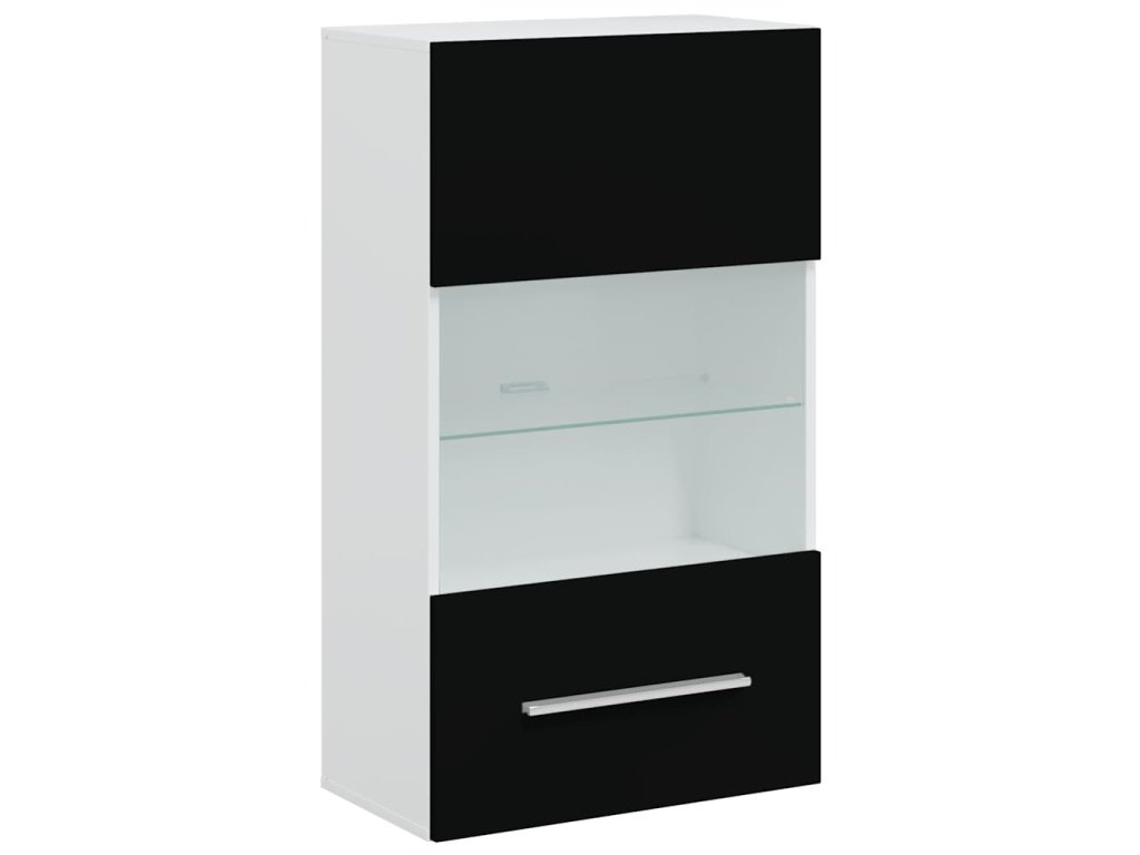 Nástenná skrinka je vyrobená z vysokokvalitného kompozitného dreva s matným bielym povrchom, zatiaľ čo čelné panely majú povrchovú úpravu s vysokým leskom, ktorá dotvára moderný vzhľad celej zostavy, vďaka čomu sa bude hodiť do každého interiéru.
