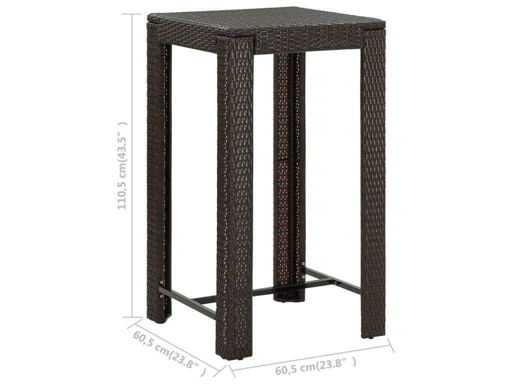 Barový stôl je opatrený oceľovým rámom s práškovanou povrchovou úpravou, vďaka čomu je stabilný a odolný. Stolová doska je ideálna na odloženie nápojov, jedla alebo dekoratívnych predmetov. Stoličky majú pevnú konštrukciu z oceľového rámu a sú vyrobené z PE ratanu odolného voči poveternostným vplyvom, čo zaisťuje ich stabilitu a ľahké premiestňovanie. Opierka nôh dodáva stoličke väčšie pohodlie počas sedenia.