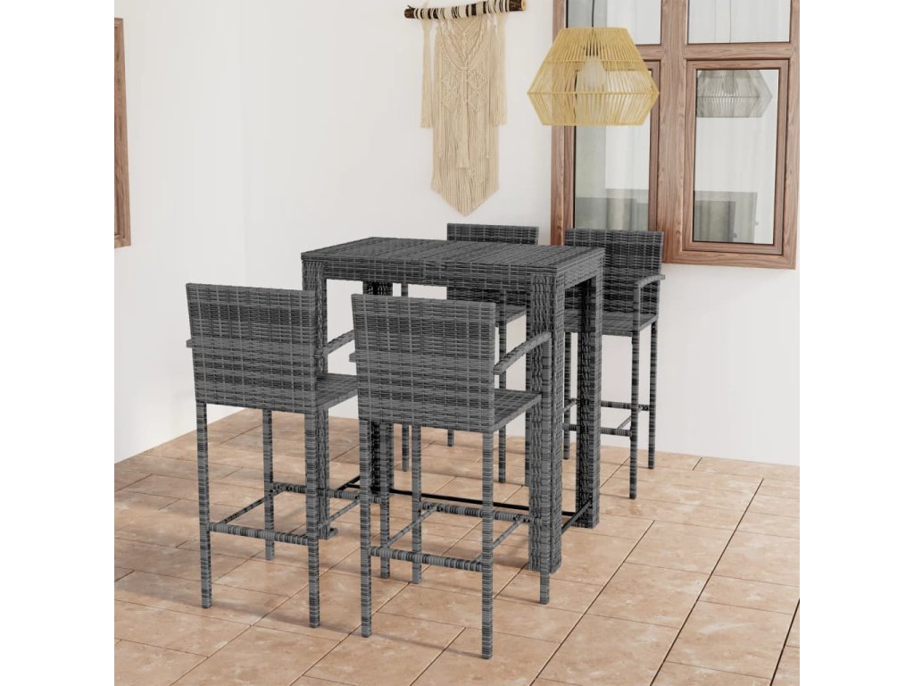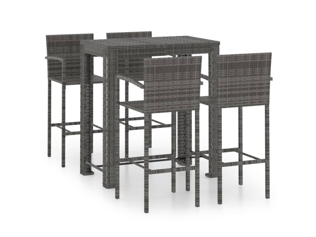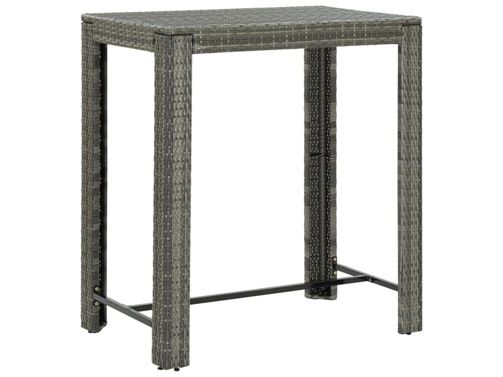 Barový stôl je opatrený oceľovým rámom s práškovanou povrchovou úpravou, vďaka čomu je stabilný a odolný. Stolová doska je ideálna na odloženie nápojov, jedla alebo dekoratívnych predmetov. Stoličky majú pevnú konštrukciu z oceľového rámu a sú vyrobené z PE ratanu odolného voči poveternostným vplyvom, čo zaisťuje ich stabilitu a ľahké premiestňovanie. Opierka nôh dodáva stoličke väčšie pohodlie počas sedenia.