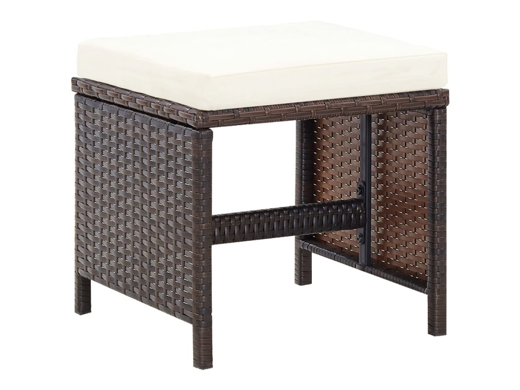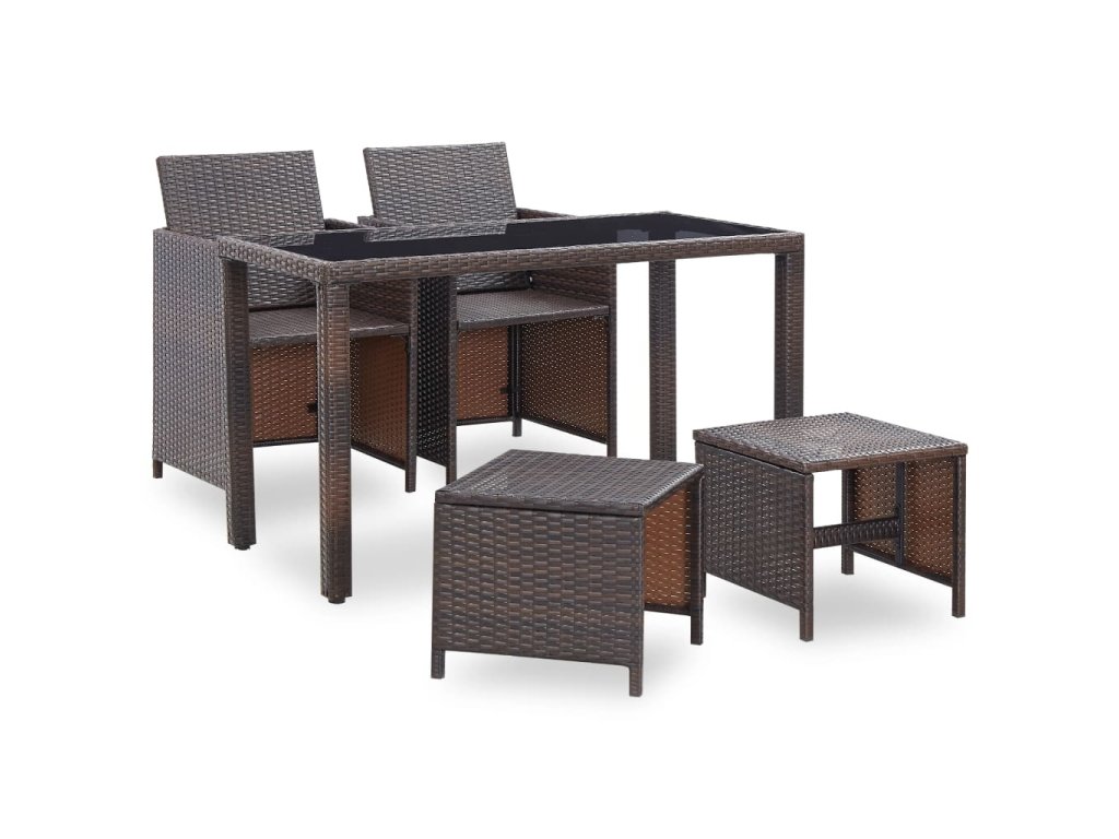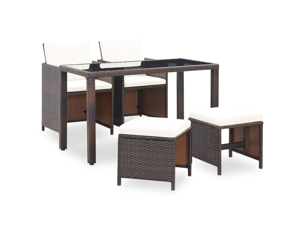 Táto ratanová jedálenská sada s elegantným dizajnom bude skvelou voľbou pre večere na čerstvom vzduchu či relaxovanie na záhrade. Majú oceľové rámy s práškovým náterom a tak sú stôl, stoličky a taburetky pevné a robustné. Vďaka ich ľahkej konštrukcii je možné všetky časti súpravy jednoducho presúvať. Polyratan je vodeodolný a odolný voči vplyvom počasia a jedálenská sada sa tak ľahko čistí. Sklenený vrch stola sa taktiež jednoducho čistí pomocou navlhčenej handričky.