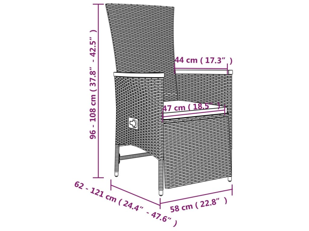 - Rozmery kresla v polohe na ležanie: 58 x 121 x 96 cm (Š x H x V)