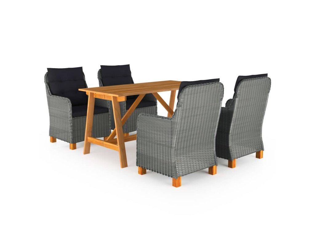 Jedálenský stôl je vyrobený z masívneho akáciového dreva s olejovou úpravou, vďaka čomu je stabilný, odolný a ľahko sa udržiava. Vonkajšie stoličky s oceľovým rámom s práškovým povrchom sú pokryté okrúhlym PE ratanom, a sú robustné a ľahko sa čistia. Husto polstrované vankúše zabezpečia ešte väčšie pohodlie počas oddychu. Poťah na vankúš je vybavený zipsom, dá sa jednoducho zvliecť a oprať. Nohy s masívneho akáciového dreva sa vyznačujú pevnosťou a stabilitou. Záhradné stoličky môžete jednoducho presúvať vďaka ich ľahkej konštrukcii.