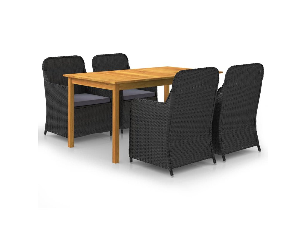 Jedálenský stôl je vyrobený z akáciového masívu s olejovým náterom, vďaka čomu je stabilný, trvácny a ľahko sa udržiava. Jedálenské stoličky majú oceľový rám s práškovou povrchovou úpravou, ktorý je pokrytý PE ratanom, vďaka čomu sú pevné a dajú sa ľahko očistiť. Ergonomický tvar s nahusto vyčalúnenými podložkami na sedadlo prinášajú optimálny komfort. Polyesterové poťahy si nevyžadujú náročnú údržbu. Stačí ich zvliecť a oprať.