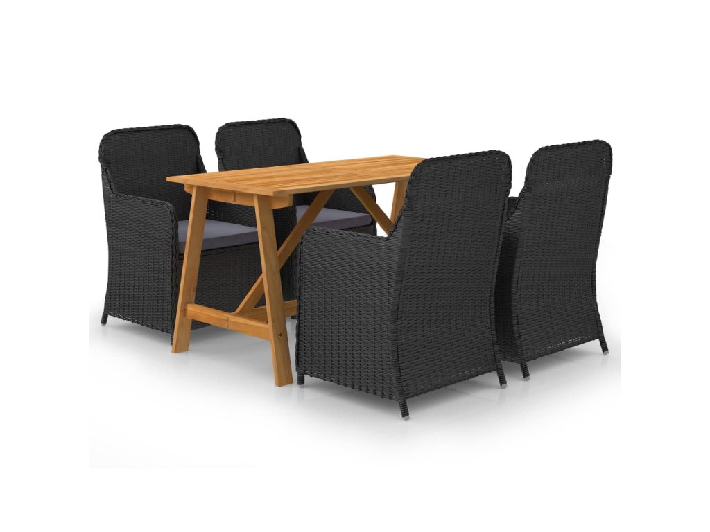 Jedálenský stôl je vyrobený z akáciového masívu s olejovým náterom, vďaka čomu je stabilný, trvácny a ľahko sa udržiava. Jedálenské stoličky majú oceľový rám s práškovou povrchovou úpravou, ktorý je pokrytý PE ratanom, vďaka čomu sú pevné a dajú sa ľahko očistiť. Ergonomický tvar s nahusto vyčalúnenými podložkami na sedadlo prinášajú optimálny komfort. Polyesterové poťahy si nevyžadujú náročnú údržbu. Stačí ich zvliecť a oprať.