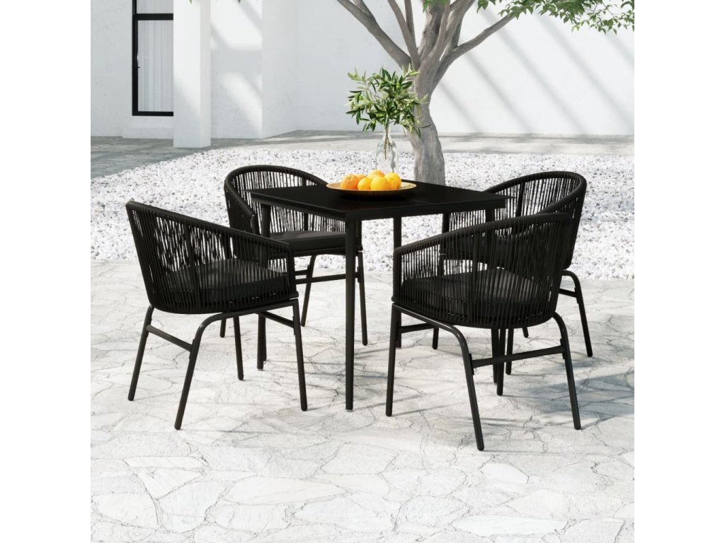 Táto záhradná jedálenská súprava je vyrobená z oceľového rámu s práškovým nástrekom, vďaka čomu je pevná a stabilná na každodenné použitie vonku. Hladká sklenená doska stola sa jednoducho čistí vlhkou handričkou a je ideálna na umiestnenie jedál, nápojov a dekoratívnych predmetov. Terasové stoličky sú vyrobené z PVC ratanu, vďaka čomu sú stabilné a odolné voči nepriazni počasia a UV žiareniu. Každé sedadlo je vybavené odnímateľným husto polstrovaným vankúšom, ktorý zvyšuje pohodlie počas sedenia.