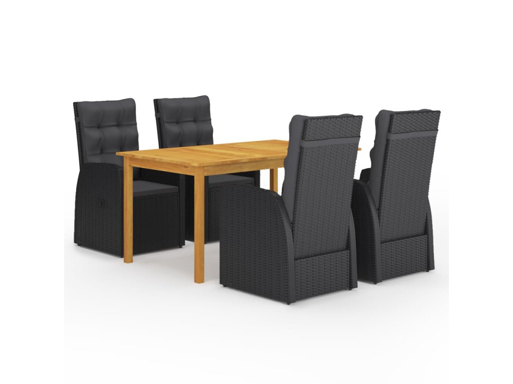 Jedálenský stôl je vyrobený z akáciového masívu s olejovým náterom, vďaka čomu je stabilný, trvácny a ľahko sa udržiava. Jedálenské stoličky majú oceľový rám s práškovou povrchovou úpravou, ktorý je pokrytý PE ratanom, vďaka čomu sú pevné a dajú sa ľahko očistiť. Stačí zatlačiť tlačidlo v bočnej časti a operadlo s podnožkou sa sklopí, takže môžete plne relaxovať. Stoličky majú ľahkú konštrukciu, a tak sa dajú jednoducho premiestňovať. Dodávajú sa spolu s veľmi pohodlnými, nahusto vyčalúnenými podložkami na sedadlo, ktoré prinášajú optimálny komfort. Polyesterové poťahy si nevyžadujú náročnú údržbu a stačí ich zvliecť a oprať.