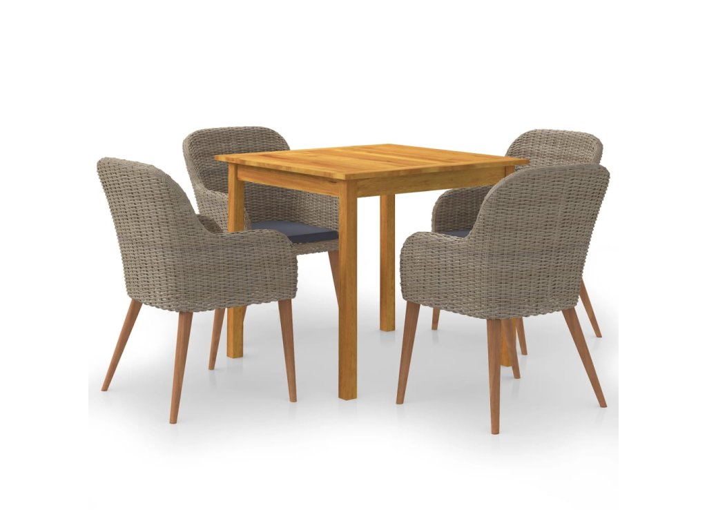 Jedálenský stôl je vyrobený z akáciového masívu s olejovým náterom, vďaka čomu je stabilný, trvácny a ľahko sa udržiava. Jedálenské stoličky majú oceľový rám s práškovou povrchovou úpravou, ktorý je pokrytý PE ratanom, vďaka čomu sú pevné a dajú sa ľahko očistiť. Ergonomický tvar s nahusto vyčalúnenými podložkami na sedadlo prinášajú optimálny komfort. Polyesterové poťahy si nevyžadujú náročnú údržbu. Stačí ich zvliecť a oprať.