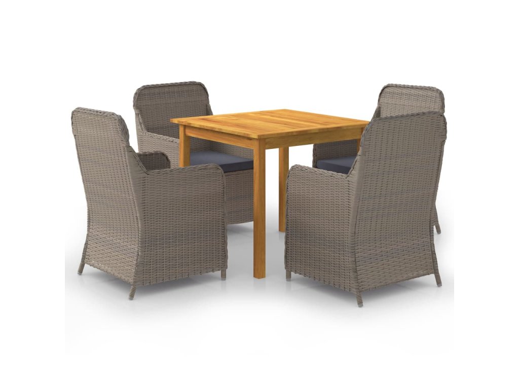 Jedálenský stôl je vyrobený z akáciového masívu s olejovým náterom, vďaka čomu je stabilný, trvácny a ľahko sa udržiava. Jedálenské stoličky majú oceľový rám s práškovou povrchovou úpravou, ktorý je pokrytý PE ratanom, vďaka čomu sú pevné a dajú sa ľahko očistiť. Ergonomický tvar s nahusto vyčalúnenými podložkami na sedadlo prinášajú optimálny komfort. Polyesterové poťahy si nevyžadujú náročnú údržbu. Stačí ich zvliecť a oprať.