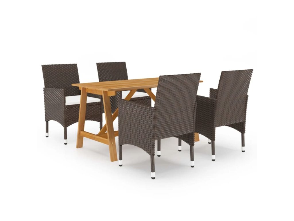 Jedálenský stôl je vyrobený z masívneho akáciového dreva s olejovou povrchovou úpravou, vďaka čomu je stabilný, odolný a ľahko sa udržiava. Vďaka práškovanému oceľovému rámu, ktorý je pokrytý vodeodolným PE ratanom sú tieto jedálenské stoličky pevné a ľahko sa čistia. Jedálenská stolička má zaoblené operadlo a lakťovú opierku, a má ergonomickejší tvar pre maximálne pohodlie. Každé sedadlo je vybavené odnímateľným husto polstrovaným vankúšom, ktorý zvyšuje pohodlie počas sedenia.