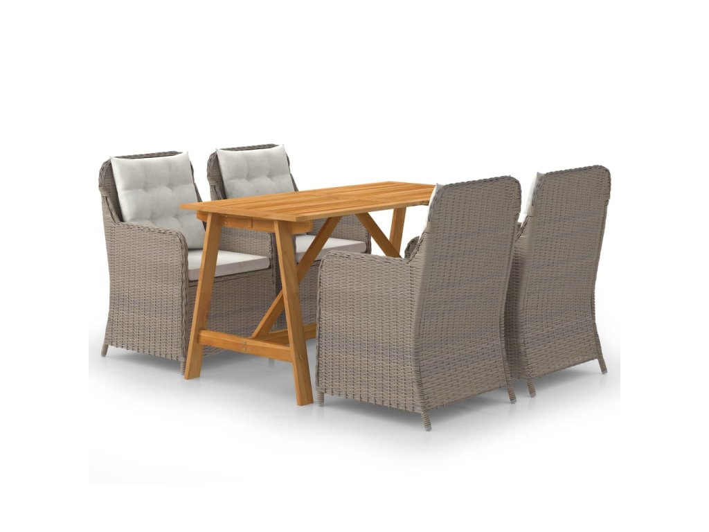 Jedálenský stôl je vyrobený z akáciového masívu s olejovým náterom, vďaka čomu je stabilný, trvácny a ľahko sa udržiava. Jedálenské stoličky majú oceľový rám s práškovou povrchovou úpravou, ktorý je pokrytý PE ratanom, vďaka čomu sú pevné a dajú sa ľahko očistiť. Ergonomický tvar s nahusto vyčalúnenými podložkami na sedadlo prinášajú optimálny komfort. Polyesterové poťahy si nevyžadujú náročnú údržbu. Stačí ich zvliecť a oprať.