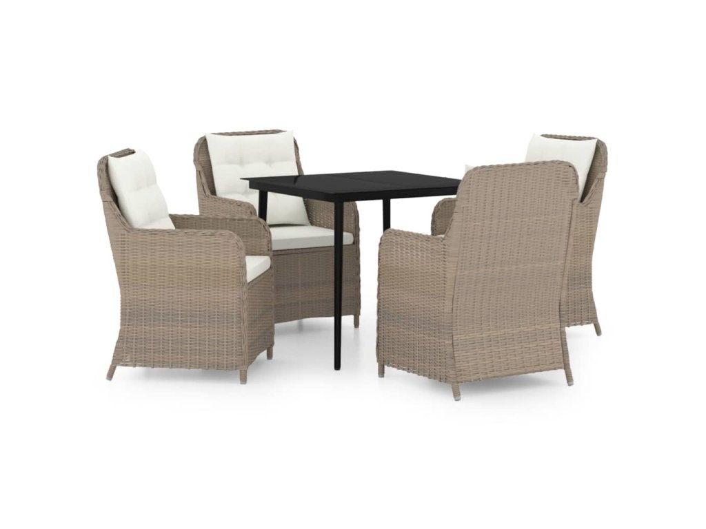 Praktická vonkajšia jedálenská súprava má oceľový rám, vďaka čomu je pevná a odolná. Záhradné stoličky sú vyrobené z vodeodolného a bezúdržbového PE ratanu, čím sú ideálne pre vonkajšie použitie. Ergonomicky tvarované a hrubo polstrované odnímateľné vankúše s penovou výplňou zaistia maximálne pohodlie počas sedenia. Polyesterové poťahy na sedáky a vankúše sú nenáročné na údržbu. Jednoducho sa dajú dať dole a vyprať. Hladká sklenená doska stola sa navyše ľahko čistí vlhkou handričkou a je vynikajúca na umiestnenie jedál, nápojov a iných dekoratívnych predmetov.
