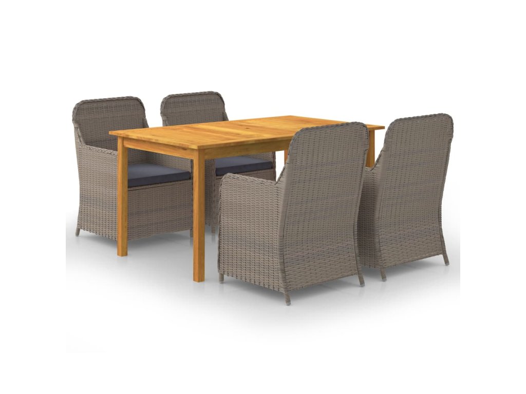 Jedálenský stôl je vyrobený z akáciového masívu s olejovým náterom, vďaka čomu je stabilný, trvácny a ľahko sa udržiava. Jedálenské stoličky majú oceľový rám s práškovou povrchovou úpravou, ktorý je pokrytý PE ratanom, vďaka čomu sú pevné a dajú sa ľahko očistiť. Ergonomický tvar s nahusto vyčalúnenými podložkami na sedadlo prinášajú optimálny komfort. Polyesterové poťahy si nevyžadujú náročnú údržbu. Stačí ich zvliecť a oprať.