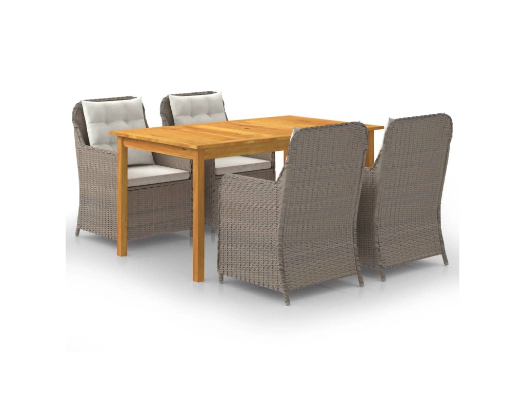 Jedálenský stôl je vyrobený z akáciového masívu s olejovým náterom, vďaka čomu je stabilný, trvácny a ľahko sa udržiava. Jedálenské stoličky majú oceľový rám s práškovou povrchovou úpravou, ktorý je pokrytý PE ratanom, vďaka čomu sú pevné a dajú sa ľahko očistiť. Ergonomický tvar s nahusto vyčalúnenými podložkami na sedadlo prinášajú optimálny komfort. Polyesterové poťahy si nevyžadujú náročnú údržbu. Stačí ich zvliecť a oprať.