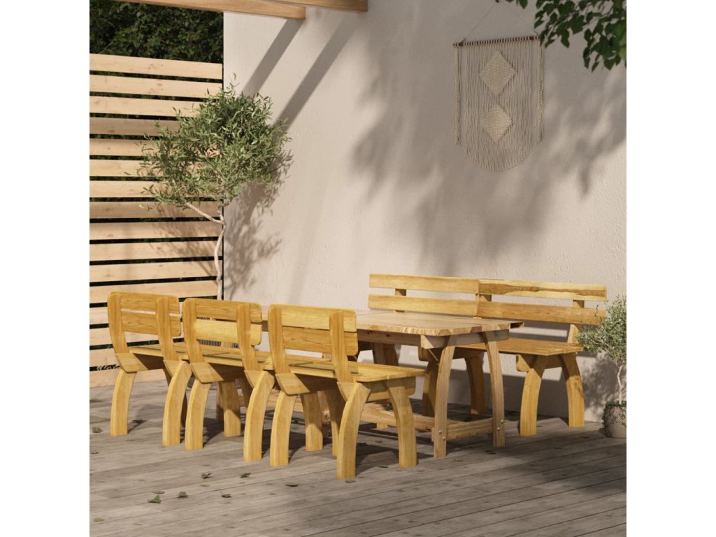 Táto drevená vonkajšia jedálenská súprava vyrobená zo zeleného impregnovaného borovicového dreva je veľmi pevná, trvácna a odolná voči korózii. Súprava nábytku je ideálnou voľbou pre chvíle oddychu v romantickej záhrade vidieckeho domu alebo pri idylickom záhradnom jazierku na večeru s rodinou a priateľmi. Upozorňujeme, že drevo je prírodný produkt a môže vykazovať nedokonalosti.