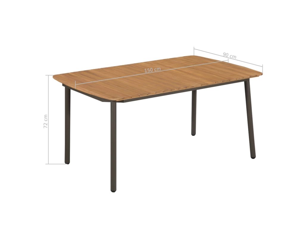 Jedálenský stôl je vyrobený z masívneho akáciového dreva a odolnej ocele, takže je pevný a stabilný. Vďaka povrchu s olejovým náterom je vhodný aj na vonkajšie použitie. Jedálenské stoličky s oceľovým rámom potiahnutým PE ratanom, ktorý je odolný voči poveternostným vplyvom, sú pevné a ľahko sa čistia. Tieto záhradné stoličky je možné stohovať, aby sa ušetrilo miesto, keď sa práve nepoužívajú.