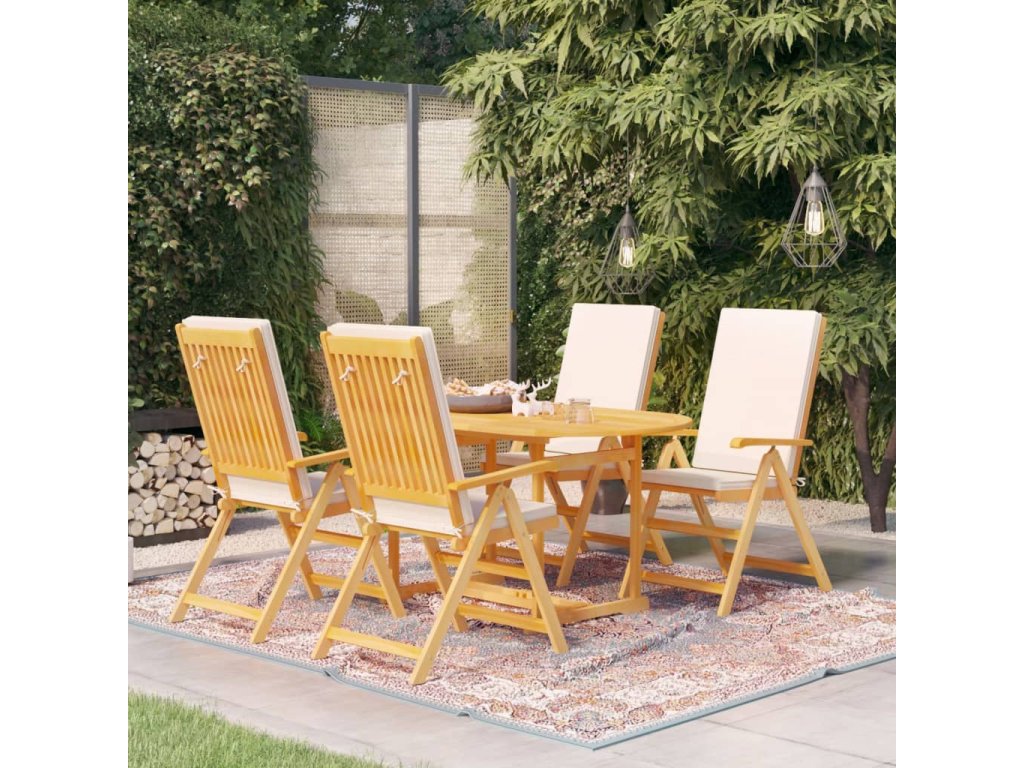 Súprava má krásnu povrchovú úpravu, ktorá dodáva drevu teplú farbu. Stôl má otvor na slnečník, čím poskytuje ochranu pred slnkom. Operadlá stoličiek sú nastaviteľné do 5 polôh, aby ste si vždy našli tú najpohodlnejšiu pozíciu. Vďaka sklopnému dizajnu sa dajú stoličky sklopiť, aby sa ušetrilo miesto, keď sa nepoužívajú. Sú tiež ľahké a ľahko sa presúvajú. Hrubé čalúnené vankúše poskytujú maximálne pohodlie a poťahy na vankúše sú odnímateľné pre ľahké pranie. Sada nábytku vám poskytuje pohodlie a príjemný čas strávený so svojou rodinou a priateľmi. Okrem toho sa táto sada ľahko čistí vlhkou handričkou.