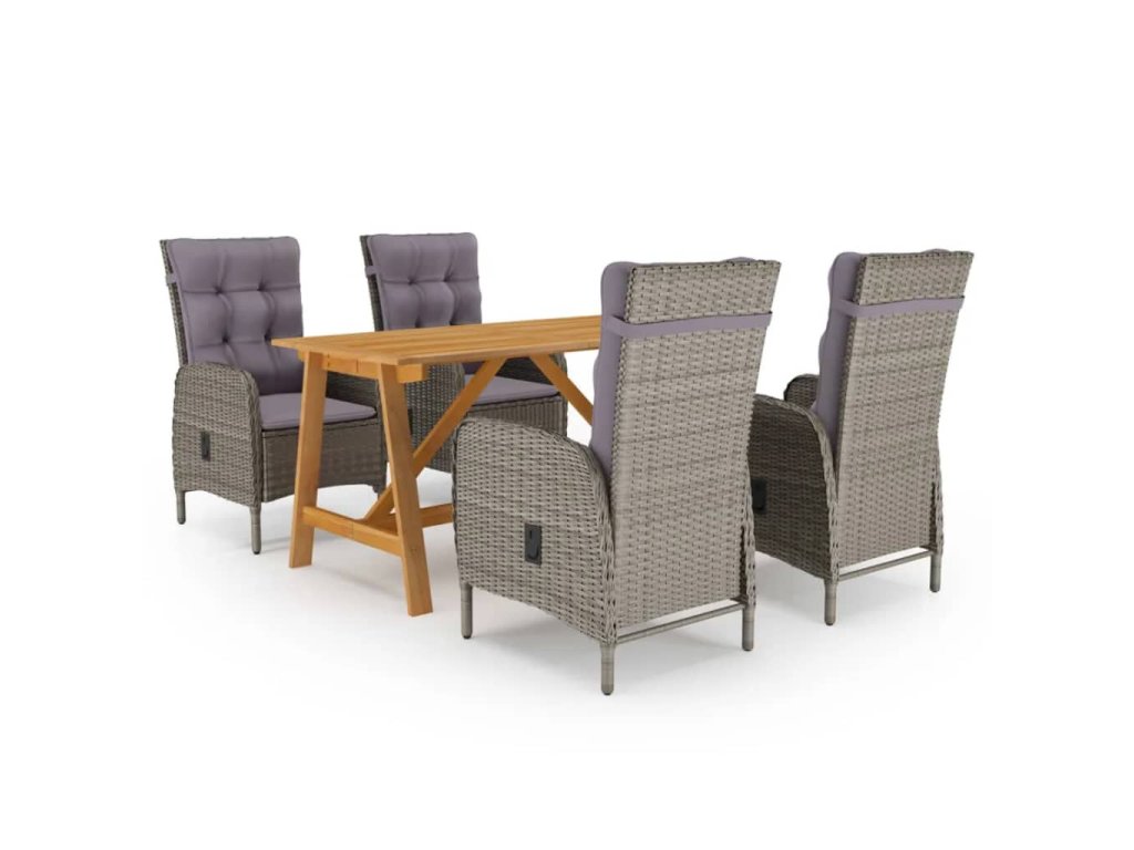 Jedálenský stôl je vyrobený z masívneho akáciového dreva s olejovou povrchovou úpravou, vďaka čomu je stabilný, odolný a ľahko sa udržiava. Vďaka oceľovému rámu s práškovou povrchovou úpravou potiahnutému PE ratanom odolným voči poveternostným vplyvom sú tieto jedálenské stoličky stabilné a ľahko sa čistia. Jedálenská stolička navrhnutá so zakriveným operadlom a opierkou na ruky má ergonomickejší tvar pre maximálne pohodlie. Súčasťou balenia sú vankúše pre väčšiu oporu a poťah na zips je odnímateľný pre jednoduché pranie.