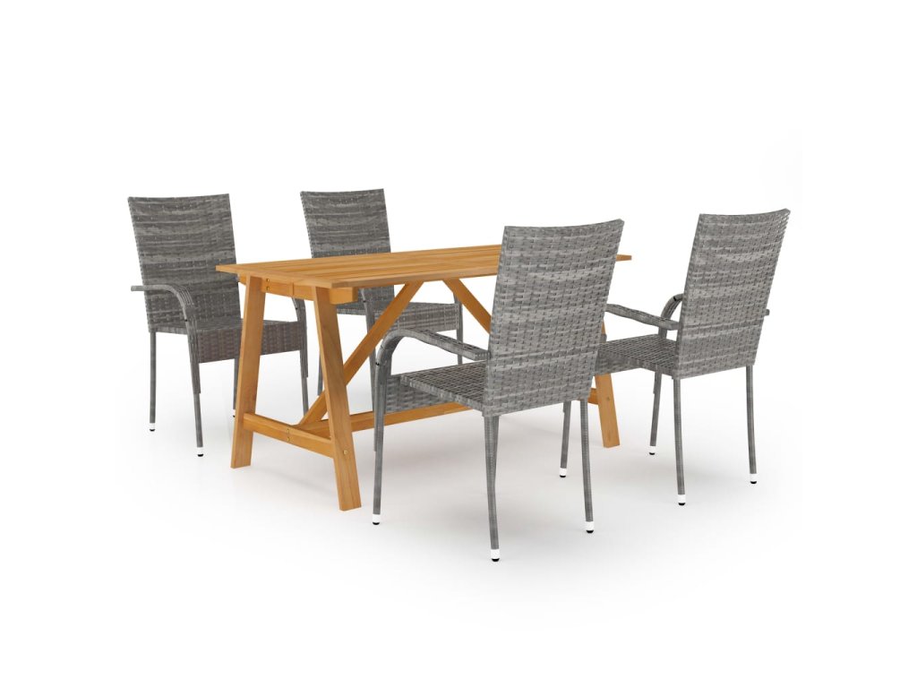 Jedálenský stôl je vyrobený z masívneho akáciového dreva s olejovou povrchovou úpravou, vďaka čomu je stabilný, odolný a ľahko sa udržiava. Tieto jedálenské stoličky s oceľovým rámom s práškovým nástrekom pokrytým PE ratanom odolným voči poveternostným vplyvom sú pevné a ľahko sa čistia. Vonkajšie stoličky sú ľahké a dajú sa skladať na seba, aby sa ušetrilo miesto, keď sa nepoužívajú.