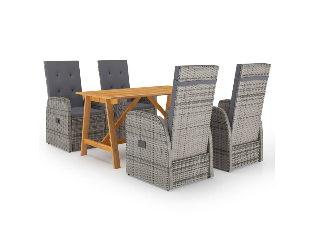 Jedálenský stôl je vyrobený z akáciového masívu s olejovým náterom, vďaka čomu je stabilný, trvácny a ľahko sa udržiava. Jedálenské stoličky majú oceľový rám s práškovou povrchovou úpravou, ktorý je pokrytý PE ratanom, vďaka čomu sú pevné a dajú sa ľahko očistiť. Stačí zatlačiť tlačidlo v bočnej časti a operadlo sa sklopí. Stoličky majú ľahkú konštrukciu, a tak sa dajú jednoducho premiestňovať. Dodávajú sa spolu s veľmi pohodlnými, nahusto vyčalúnenými podložkami na sedadlo, ktoré prinášajú optimálny komfort. Polyesterové poťahy si nevyžadujú náročnú údržbu a stačí ich zvliecť a oprať.
