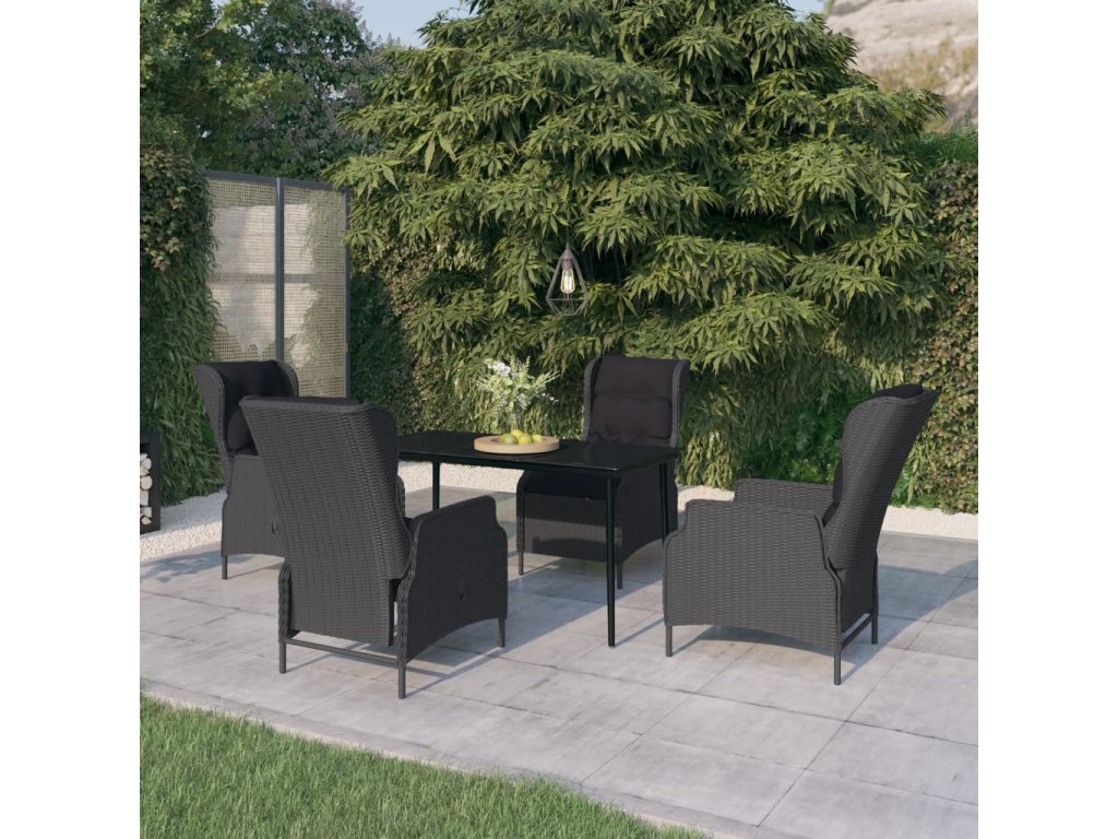 Praktická vonkajšia jedálenská súprava má oceľový rám, vďaka čomu je pevná a odolná. Záhradné polohovacie kreslá sú vyrobené z vodeodolného a bezúdržbového PE ratanu, čím sú ideálne na vonkajšie použitie. Hrubo čalúnené vankúše poskytnú extra pohodlie pri stolovaní. Poťah na vankúš má zips a dá sa oprať. Vďaka plynovému zdvíhaciemu mechanizmu je operadlo stoličky nastaviteľné, aby vyhovovalo vašej polohe. Dotykom tlačidla na boku sa dá operadlo sklopiť do pohodlnej polohy. Hladká sklenená doska stola sa ľahko čistí vlhkou handričkou a je vynikajúca na umiestnenie jedál, nápojov a iných dekoratívnych predmetov.