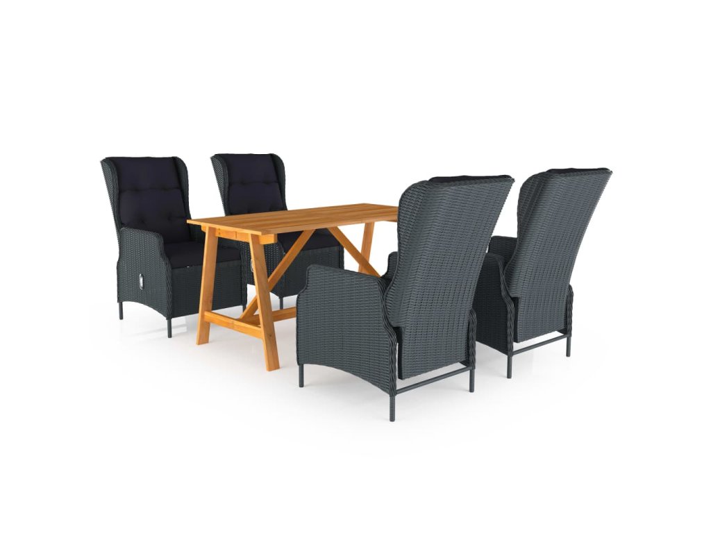 Jedálenský stôl je vyrobený z masívneho akáciového dreva s olejovou povrchovou úpravou, vďaka čomu je stabilný, odolný a ľahko sa udržiava. Vonkajšia stolička s oceľovým rámom s práškovým nástrekom pokrytá okrúhlym PE ratanom je pevná a ľahko sa čistí. Podložky s hustou výplňou vám poskytnú dokonalé pohodlie počas oddychu. Poťah na zips sa dá zvliecť a oprať. Operadlo sa dá podľa potreby polohovať vďaka mechanizmu plynového piestu. Stačí stlačiť tlačidlo na boku a operadlo sa sklopí, aby sa vám ležalo čo najpohodlnejšie. Záhradné kreslo má ľahkú konštrukciu, takže sa dá jednoducho presúvať.