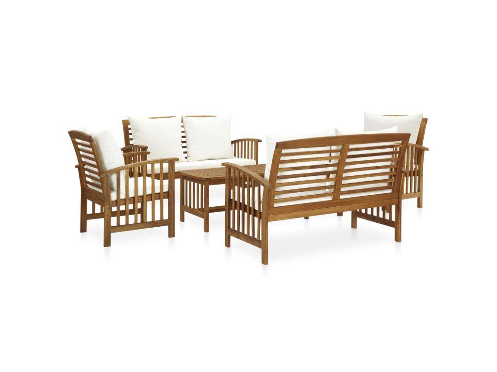 Súprava vonkajšieho nábytku má konštrukciu z akáciového masívu s olejovým náterom, vďaka čomu je stabilná a trvácna. Hrubé podložky na sedadlá a operadlá sa postarajú o to, aby sa vám sedelo naozaj príjemne. Konferenčný stolík má dosku z dreveného masívu s latkovým dizajnom, na ktorú si môžete položiť pochutiny, košíky s ovocím či rôzne ozdobné predmety. Mierne zaoblené operadlo a opierky na ruky zvyšujú pohodlie pri sedení na lavičke a stoličke.