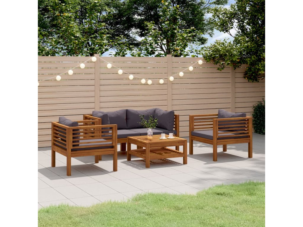 Sedacia súprava s rámom z akáciového masívu je pevná, robustná a trvácna. Súprava pohoviek je ošetrená olejovým náterom, vďaka čomu je vhodná do exteriéru. Odnímateľné podložky s hustou výplňou poskytujú maximálne pohodlie. Súčasťou súpravy je aj konferenčný stolík s jedinečným latkovým dizajnom. Vďaka praktickej modulárnej konštrukcii sa jednotlivé diely dajú ľubovoľne usporiadať a prispôsobiť okolitému prostrediu.
