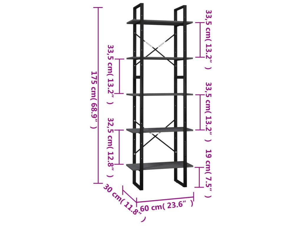 Knižnica je vyrobená z borovicového dreva a kovového rámu, čo zaručuje jej odolnosť, trvácnosť a dlhodobú životnosť. Je vybavená 5 poličkami a ponúka dostatok úložného priestoru na umiestnenie kníh, časopisov a iných dekoratívnych predmetov. Knižnica sa ľahko čistí vlhkou handričkou.