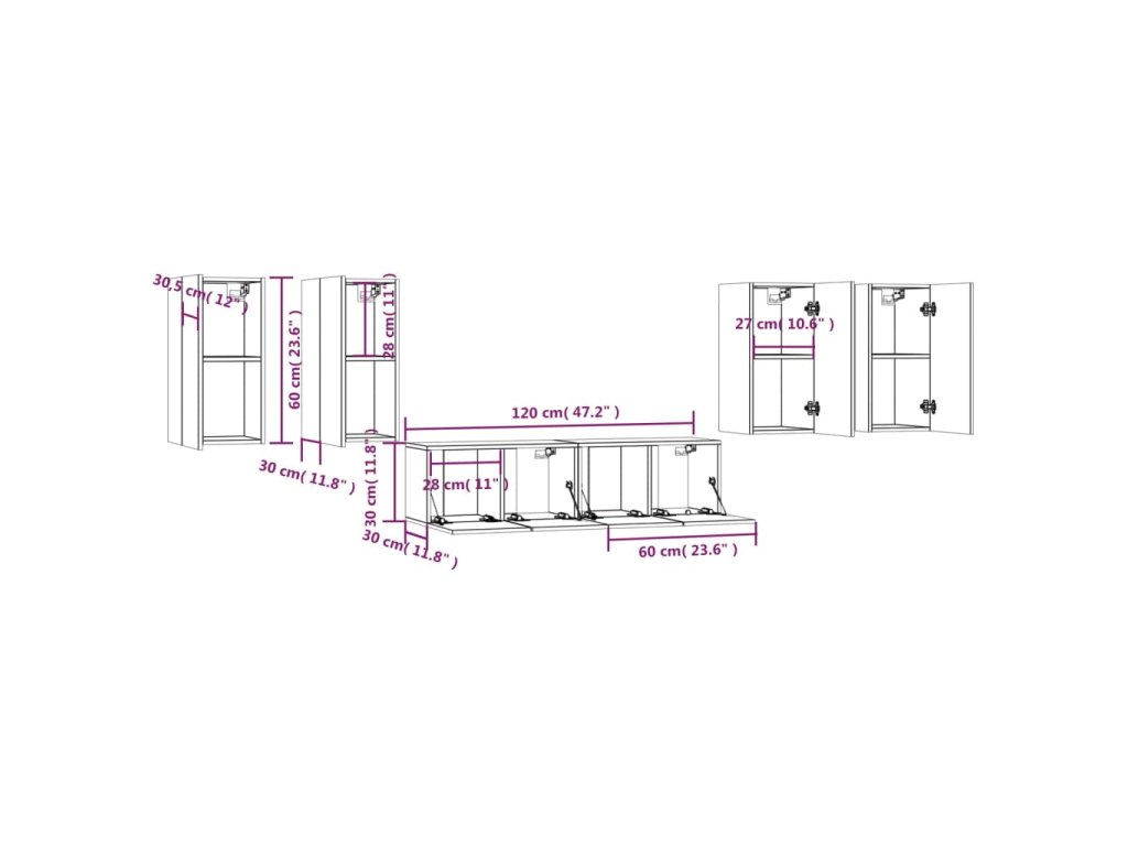 - Rozmery TV skrinky (veľká): 30,5 x 30 x 60 cm (Š x H x V)