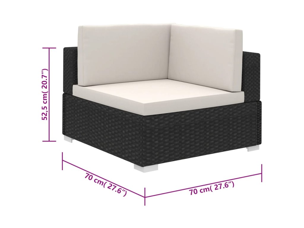 - V balení sa nachádza 1 x rohové kreslo, 2 x kreslo bez opierok na ruky, 2 x taburetka, 1 x konferenčný stolík so sklenenou doskou, 5 x čalúnená podložka na sedadlo a 4 x čalúnená podložka na operadlo.