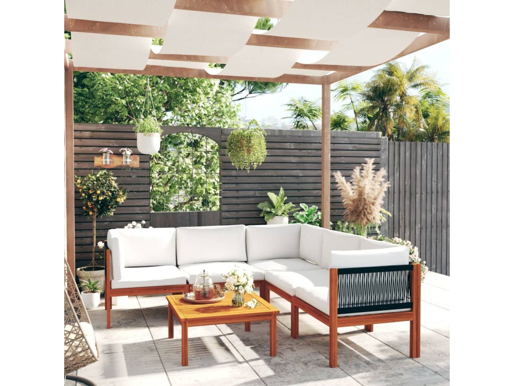 Záhradná pohovka sa vyznačuje prepracovanými lanovými operadlami, ktoré dodávajú sofistikovaný nádych každému vonkajšiemu priestoru. Táto záhradná súprava je vyrobená z vysoko kvalitného masívneho akáciového dreva, tropického tvrdého dreva, ktoré je odolné voči poveternostným vplyvom a veľmi trvácne. Vďaka olejovej úprave má súprava záhradného nábytku teplú farbu a ľahko sa čistí a udržiava. Okrem toho balenie obsahuje vankúše na sedadlo a operadlo s hrubým polstrovaním pre maximálne pohodlie pri sedení.