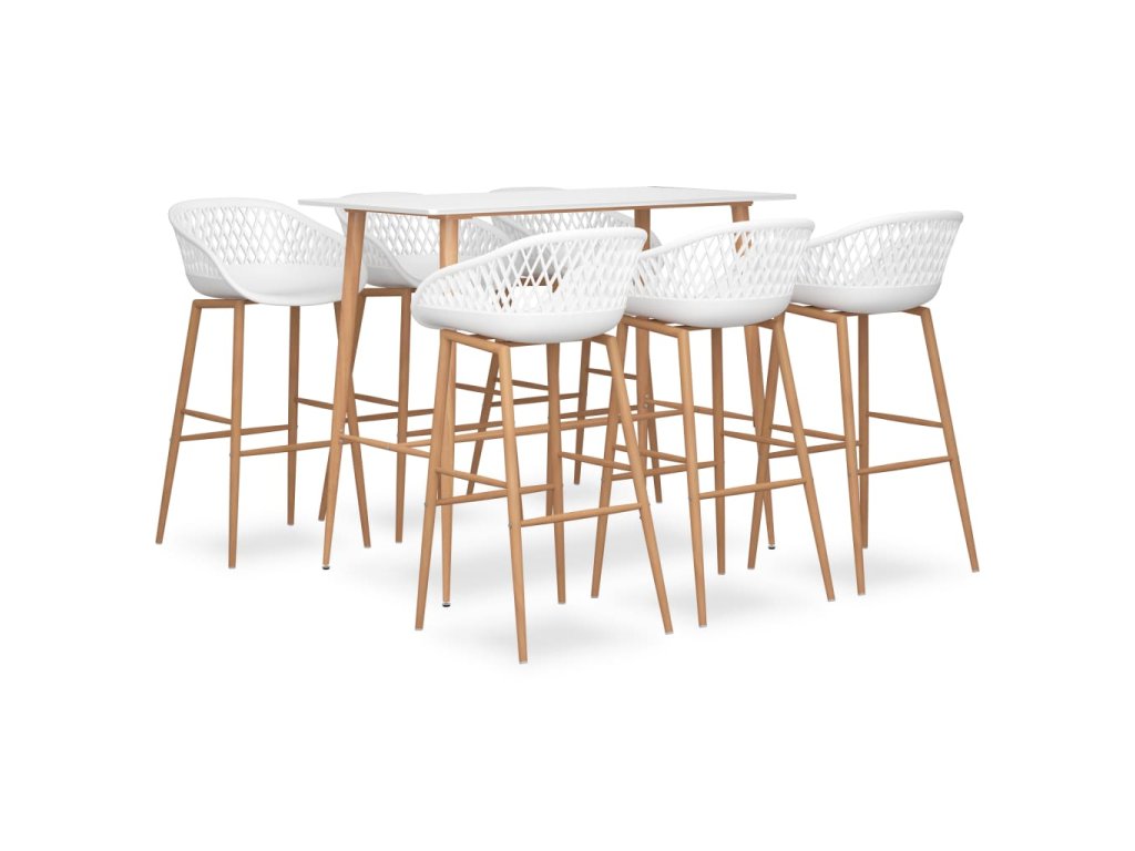 Stôl obsahuje trvácnu dosku z MDF a pevné kovové nohy s dreveným vzhľadom. Barové stoličky majú ergonomicky tvarované sedadlo s integrovaným nízkym operadloms mriežkovaným vzhľadom. Stoličky k baru sú vyrobené z pevného PP a stoja na pevných kovových nohách s transferovou potlačou s dreveným vzhľadom, vďaka čomu sú naozaj stabilné a trvácne.