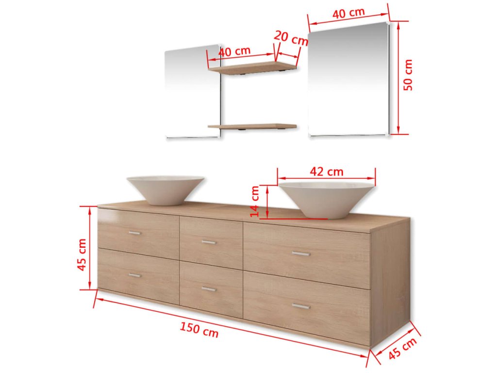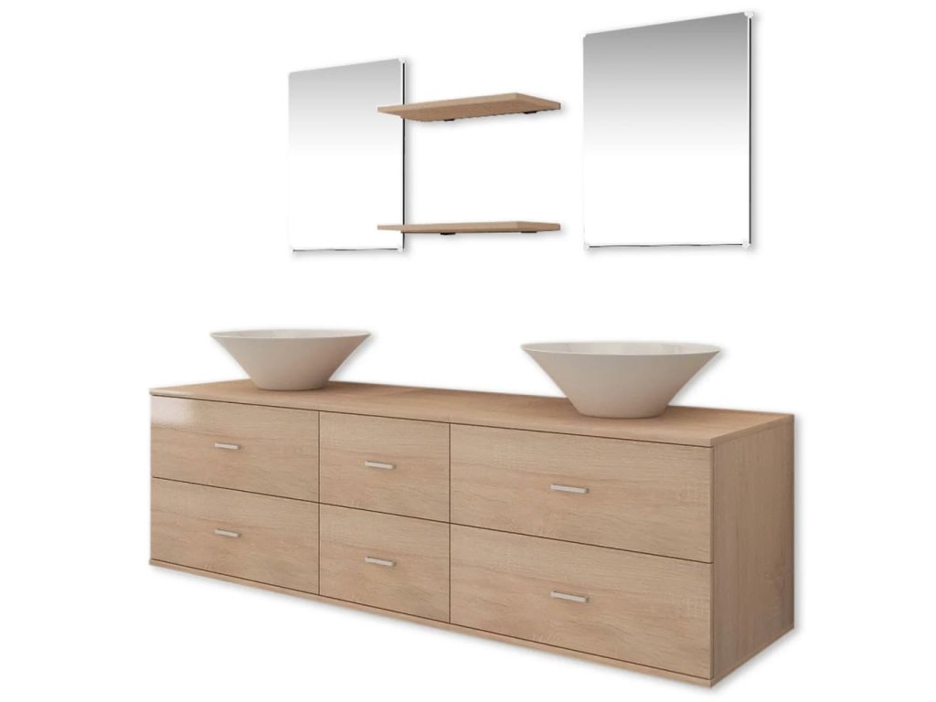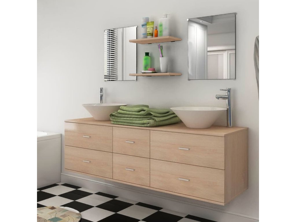 Táto kompletná sada pozostáva z 1 nástennej skrinky pod umývadlo, 2 zrkadiel, 2 poličiek a 2 umývadiel a predstavuje skvelý spôsob, ako si zariadiť kúpeľňu a zároveň jej dodať štýlový vzhľad.