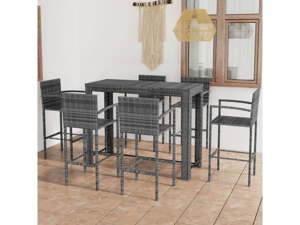 Barový stôl je opatrený oceľovým rámom s práškovanou povrchovou úpravou, vďaka čomu je stabilný a odolný. Stolová doska je ideálna na odloženie nápojov, jedla alebo dekoratívnych predmetov. Stoličky majú pevnú konštrukciu z oceľového rámu a sú vyrobené z PE ratanu odolného voči poveternostným vplyvom, čo zaisťuje ich stabilitu a ľahké premiestňovanie. Opierka nôh dodáva stoličke väčšie pohodlie počas sedenia.
