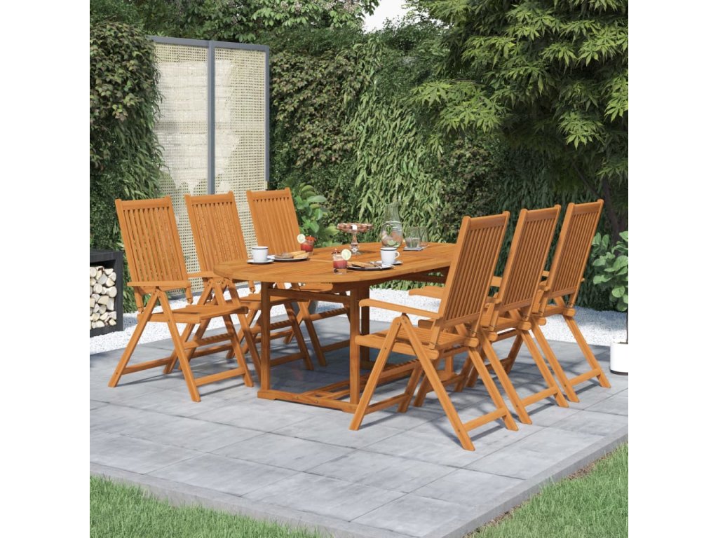 Táto štýlová a moderná súprava jedálenského nábytku pozostáva z 1 oválneho rozkladacieho stola a 6 skladacích stoličiek a dodá každému stolovaniu luxusnú atmosféru. Naša súprava dreveného jedálenského nábytku zaručene upúta vo vašej záhrade, na terase či verande.