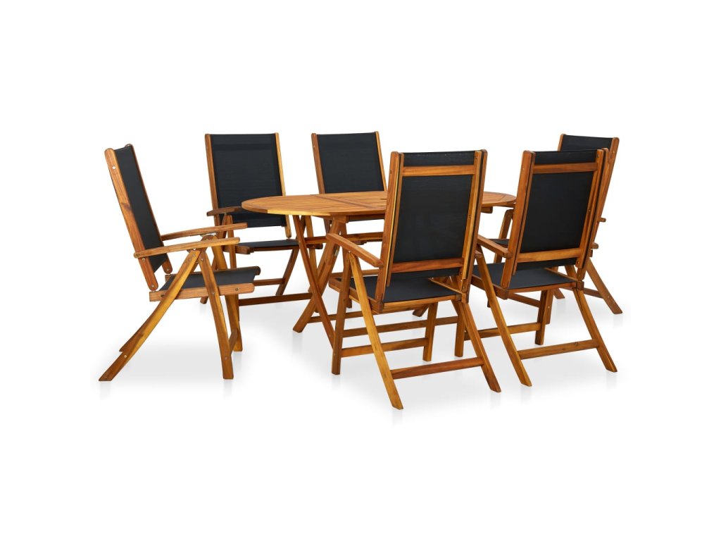 Náš set dreveného záhradného nábytku sa stane ústredným prvkom vašej záhrady, terasy alebo dvora. Jedálenský stôl je vyrobený z vysoko kvalitného akáciového dreva, tvrdého tropického dreva, ktoré je odolné voči poveternostným vplyvom a je veľmi trvácne. Povrch je ošetrený tmavým olejovým náterom a ľahko sa čistí vlhkou handričkou. Stoličky sa dajú nastaviť do 5 polôh a majú hladké textilné čalúnenie, ktoré je mäkké na dotyk a odolné voči poveternostným vplyvom, takže sa vám na nich bude vždy sedieť pohodlne. Ak súpravu práve nepoužívate, môžete stôl aj stoličky zložiť, aby ste ušetrili miesto.