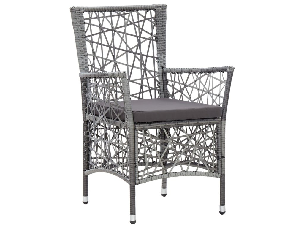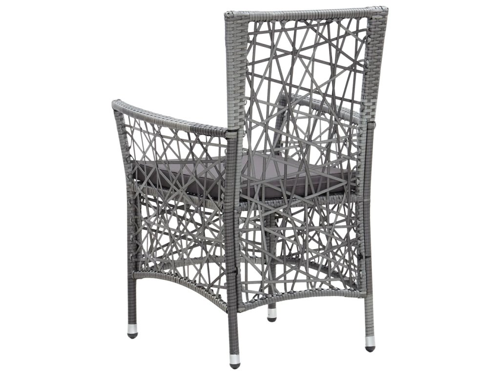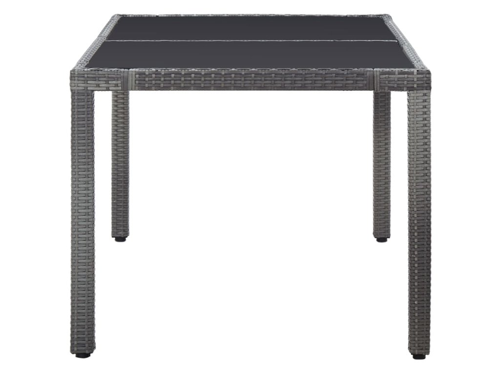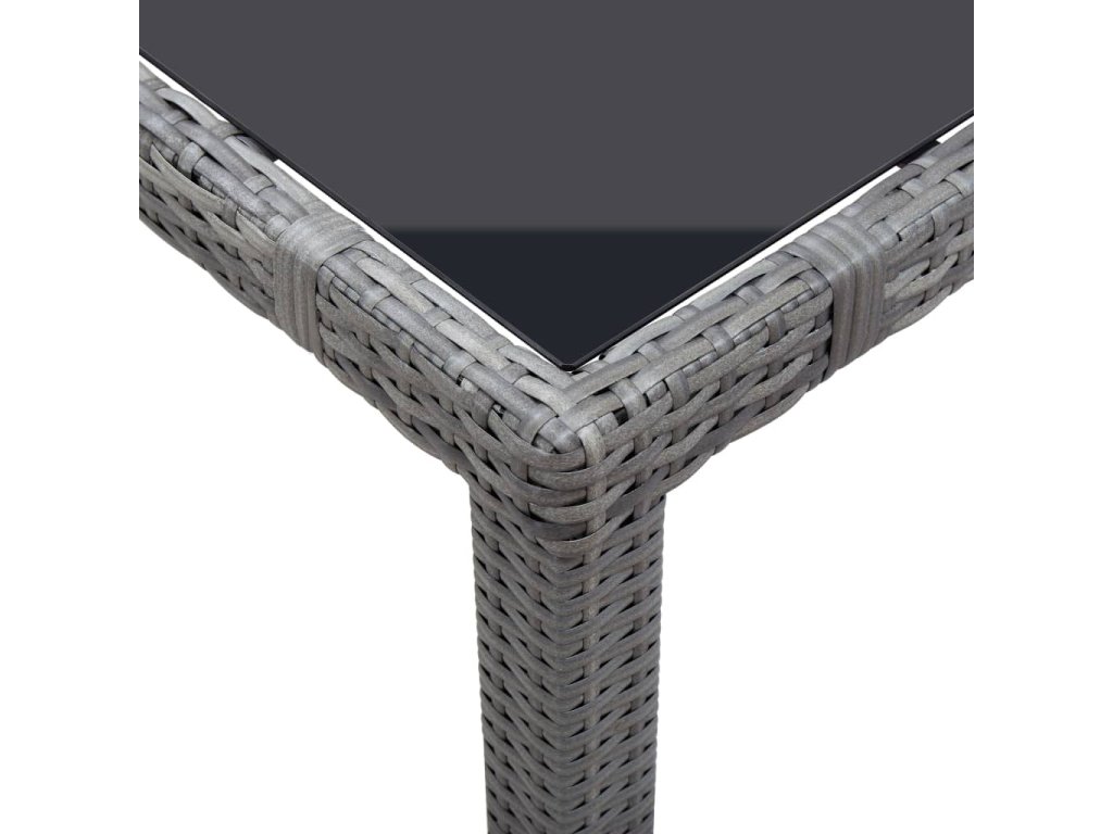 Záhradný stôl a stoličky sú odolné, ľahko sa udržiavajú a sú vhodné pre každodenné vonkajšie používanie, pretože sú vyrobené z vodeodolného PE ratanu. Vďaka oceľovým rámom je súprava odolná a stabilná. Stôl má dosku z tvrdeného skla a jedálenské stoličky majú jedinečný ozdobný pletený motív s otvormi. Každá stolička je dodávaná s pohodlným odnímateľným sedákom.