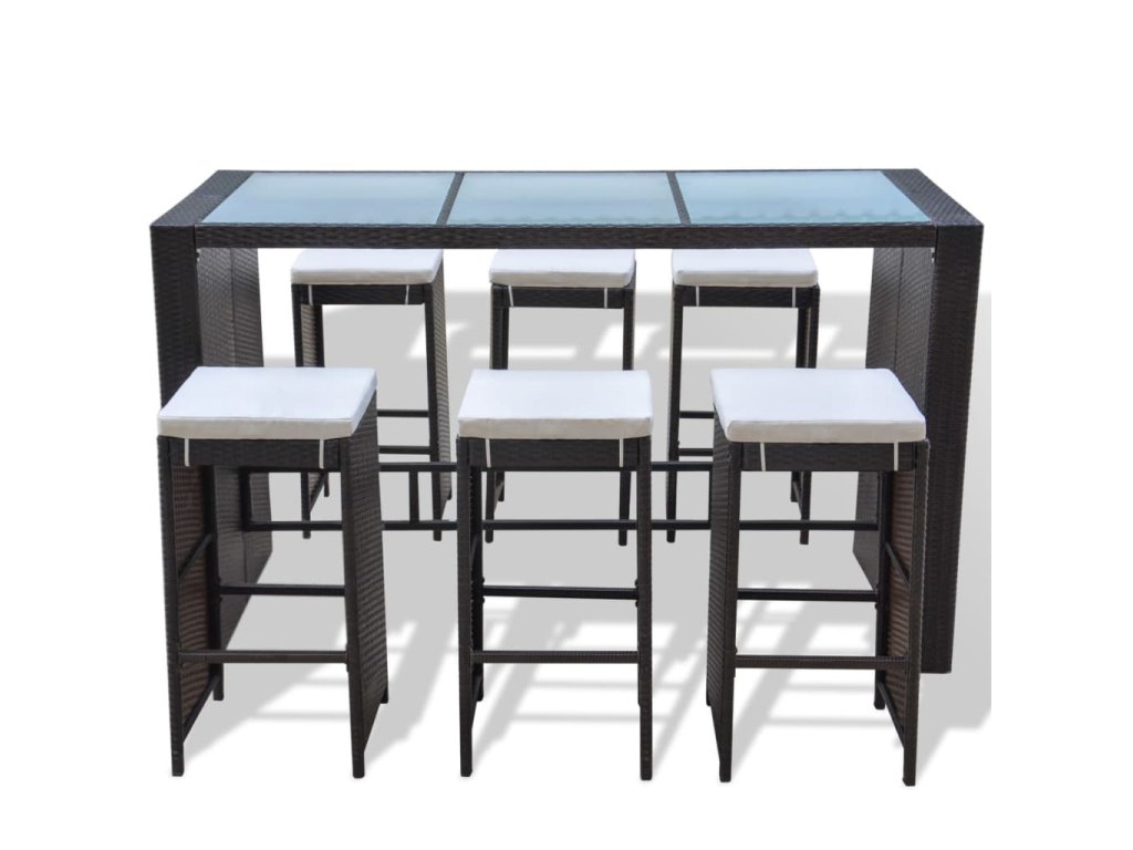 Zásielka zahŕňa 1 stôl so sklenenou doskou, 6 barových stoličiek a 6 odnímateľných podložiek na sedadlo.