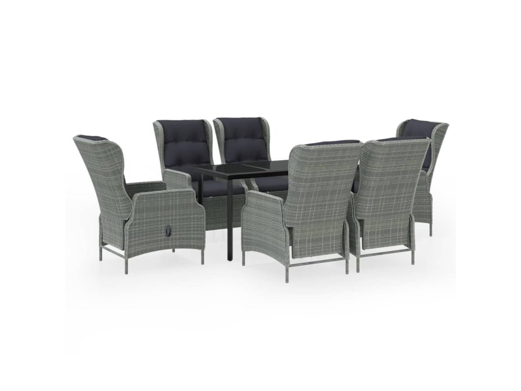 Praktická vonkajšia jedálenská súprava má oceľový rám, vďaka čomu je pevná a odolná. Záhradné polohovacie kreslá sú vyrobené z vodeodolného a bezúdržbového PE ratanu, čím sú ideálne na vonkajšie použitie. Hrubo čalúnené vankúše poskytnú extra pohodlie pri stolovaní. Poťah na vankúš má zips a dá sa oprať. Vďaka plynovému zdvíhaciemu mechanizmu je operadlo stoličky nastaviteľné, aby vyhovovalo vašej polohe. Dotykom tlačidla na boku sa dá operadlo sklopiť do pohodlnej polohy. Hladká sklenená doska stola sa ľahko čistí vlhkou handričkou a je vynikajúca na umiestnenie jedál, nápojov a iných dekoratívnych predmetov.