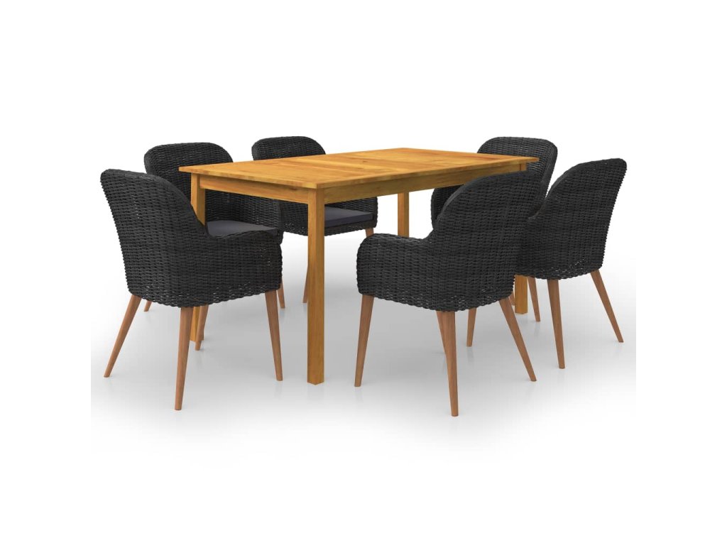 Jedálenský stôl je vyrobený z akáciového masívu s olejovým náterom, vďaka čomu je stabilný, trvácny a ľahko sa udržiava. Jedálenské stoličky majú oceľový rám s práškovou povrchovou úpravou, ktorý je pokrytý PE ratanom, vďaka čomu sú pevné a dajú sa ľahko očistiť. Ergonomický tvar s nahusto vyčalúnenými podložkami na sedadlo prinášajú optimálny komfort. Polyesterové poťahy si nevyžadujú náročnú údržbu. Stačí ich zvliecť a oprať.