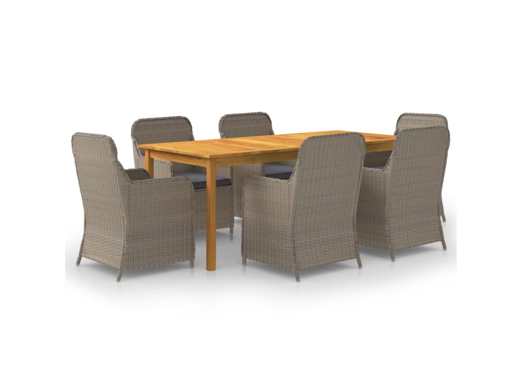 Jedálenský stôl je vyrobený z akáciového masívu s olejovým náterom, vďaka čomu je stabilný, trvácny a ľahko sa udržiava. Jedálenské stoličky majú oceľový rám s práškovou povrchovou úpravou, ktorý je pokrytý PE ratanom, vďaka čomu sú pevné a dajú sa ľahko očistiť. Ergonomický tvar s nahusto vyčalúnenými podložkami na sedadlo prinášajú optimálny komfort. Polyesterové poťahy si nevyžadujú náročnú údržbu. Stačí ich zvliecť a oprať.